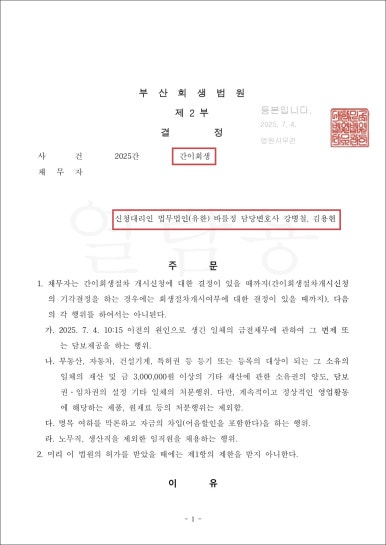 2025. 7. 4.일자 부산회생법원 법인회생사건에서 보전처분 결정을 받음