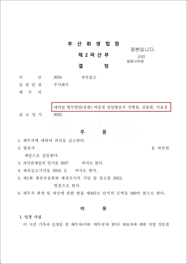 [ 부산법인파산변호사 ] 부산회생법원 법인파산사건에서 간이파산 결정 선고받음
