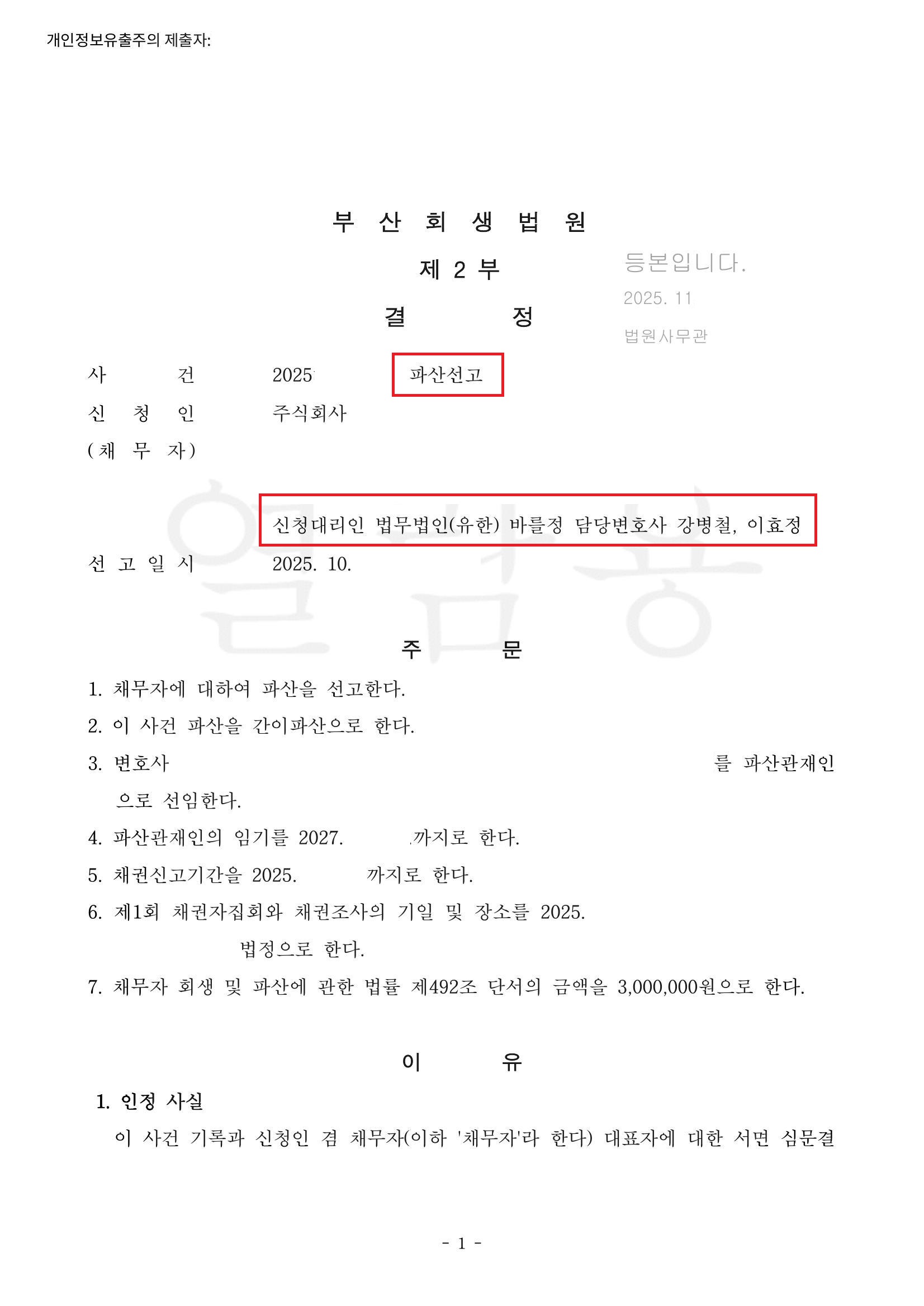 [ 부산법인파산변호사 ] 부산회생법원 법인파산사건에서 간이파산 결정 선고받음