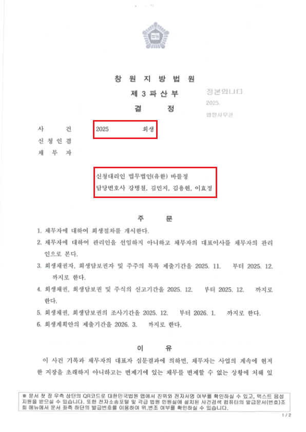 이번 결정은 단순히 채무 부담을 덜어주는 절차가 아니라, 기업의 존속가치가 청산가치보다 높다고 인정될 때에만 허가되는 ‘회생절차의 시작’을 공식적으로 승인받은 것입니다.